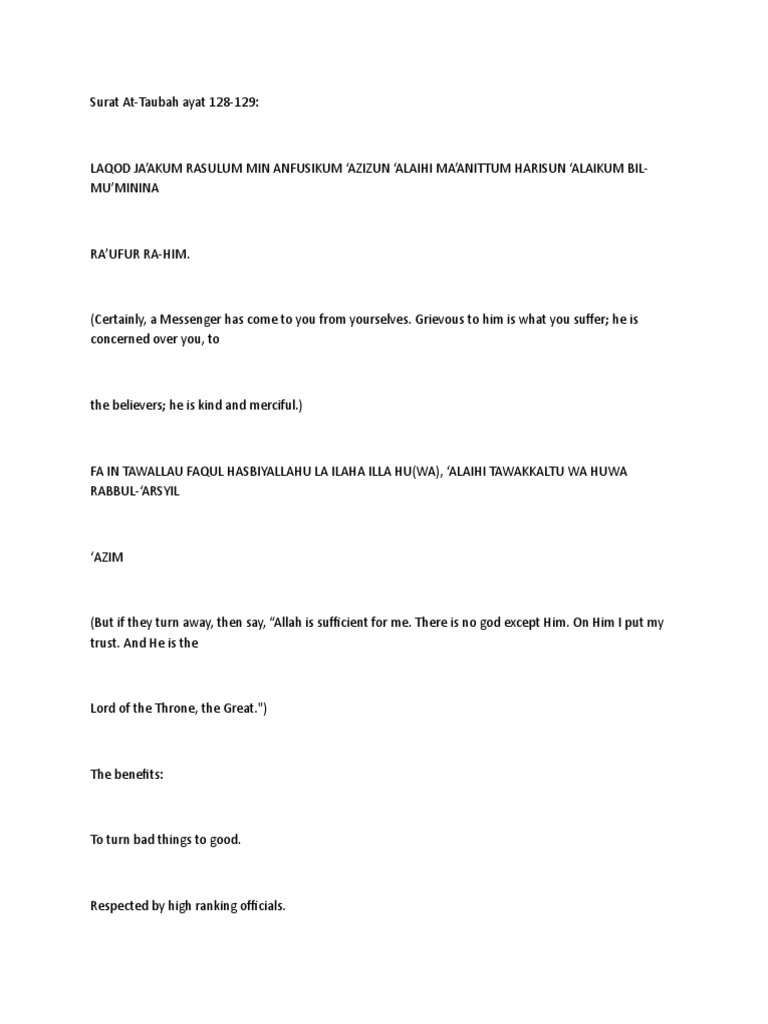 Dibaca 7 x sehabis shalat maghrib, insya allah rejeki akan lancar 2 surat at taubah ayat 128 129. Surah ini diturunkan di madinah, mengandungi mengan dungi 129 ayat.